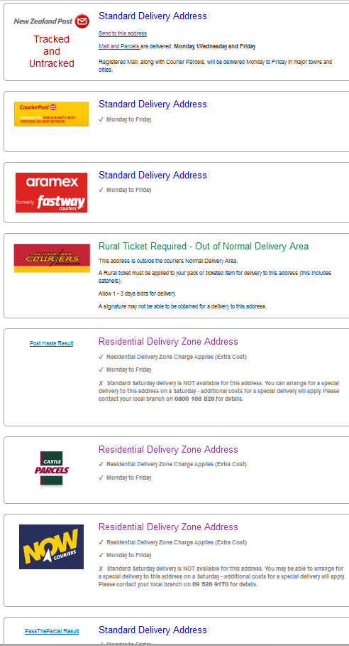 flossy63 Community SuperuserYou will need to edit your post and remove your address, but using the address checker these are what couriers say,all couriers have different boundaries,for example, Warkworth is part of Auckland but NZ post boundaries are smaller, and it is outside the postal boundaries, so considered Within Island not Auckland,