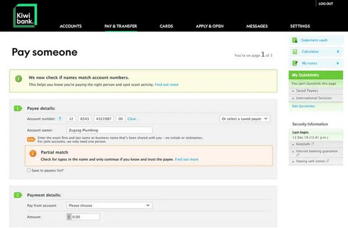 Kiwibank says "In the past, you may have entered initials or a nickname when making a payment. The new service requires you to enter the exact first and last name, or business name, registered to the account, into the Account owner field. So, be sure to ask the person or business you’re paying to share the exact name on their account - not just their account number. A business’ account name could be the legal name of the company, rather than its trading name."