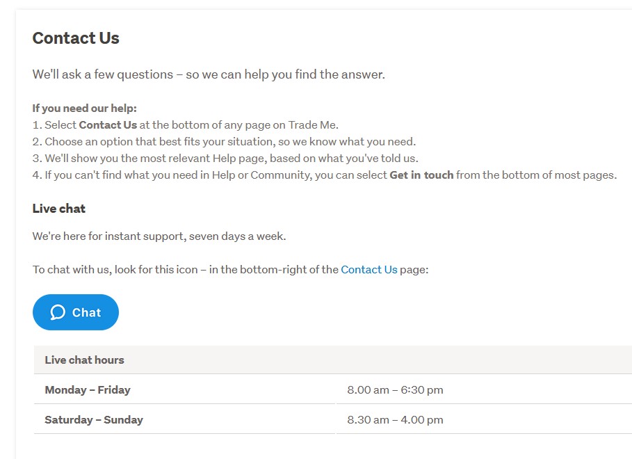 To contact Trade Me use Live Chat. Go to Contact Us at the bottom of any page (including this one) the blue chat bubble will then appear. There won't be anyone there now, I will add a picture from the help page which shows how it works and what the hours are.