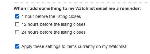 I have just tried this on a new random item and this is what actually happens. The original items in my watchlist still show the 1 hour and 12 hour email times but the new item in the watchlist shows "None". This means that whenever you add a new item to your Watchlist you must go into email preferences and the tick " Apply these settings to items currently on my Watchlist" and then "Save Changes" at the bottom of the email preferences.