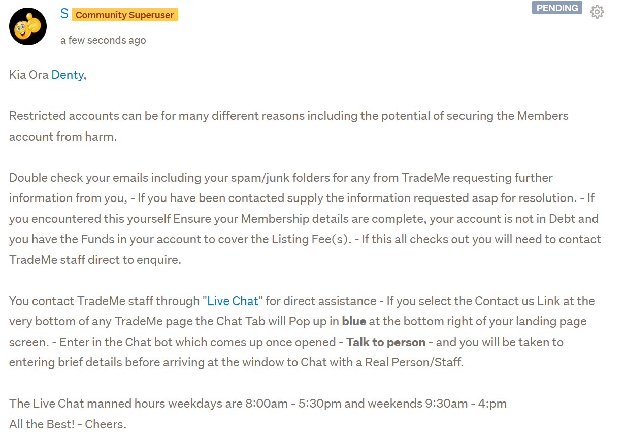 S Community SuperuserKia Ora Denty,Restricted accounts can be for many different reasons including the potential of securing the Members account from harm.Double check your emails including your spam/junk folders for any from TradeMe requesting further information from you, - If you have been contacted supply the information requested asap for resolution. - If you encountered this yourself Ensure your Membership details are complete, your account is not in Debt and you have the Funds in your account to cover the Listing Fee(s). - If this all checks out you will need to contact TradeMe staff direct to enquire.You contact TradeMe staff through "Live Chat" for direct assistance - If you select the Contact us Link at the very bottom of any TradeMe page the Chat Tab will Pop up in blue at the bottom right of your landing page screen. - Enter in the Chat bot which comes up once opened - Talk to person - and you will be taken to entering brief details before arriving at the window to Chat with a Real Person/Staff.The Live Chat manned hours weekdays are 8:00am - 5:30pm and weekends 9:30am - 4:pmAll the Best! - Cheers.0