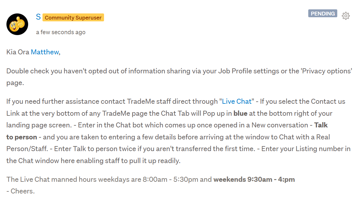 If you need further assistance contact TradeMe staff direct through "Live Chat" - If you select the Contact us Link at the very bottom of any TradeMe page the Chat Tab will Pop up in blue at the bottom right of your landing page screen. - Enter in the Chat bot which comes up once opened in a New conversation - Talk to person - and you are taken to entering a few details before arriving at the window to Chat with a Real Person/Staff. - Enter Talk to person twice if you aren't transferred the first time. - Enter your Listing number in the Chat window here enabling staff to pull it up readily.