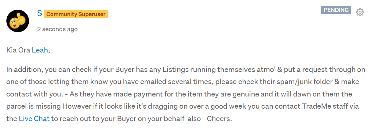 My Comment for you has gone into Pending Status awaiting a TradeMe staff member to clear - Meantime this is how it reads for you - Cheers.