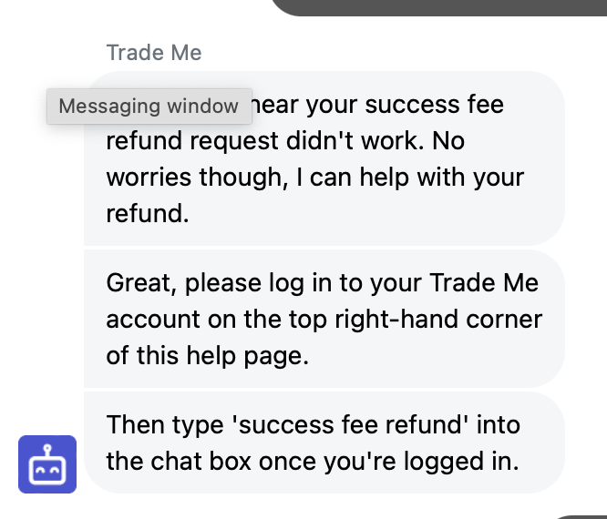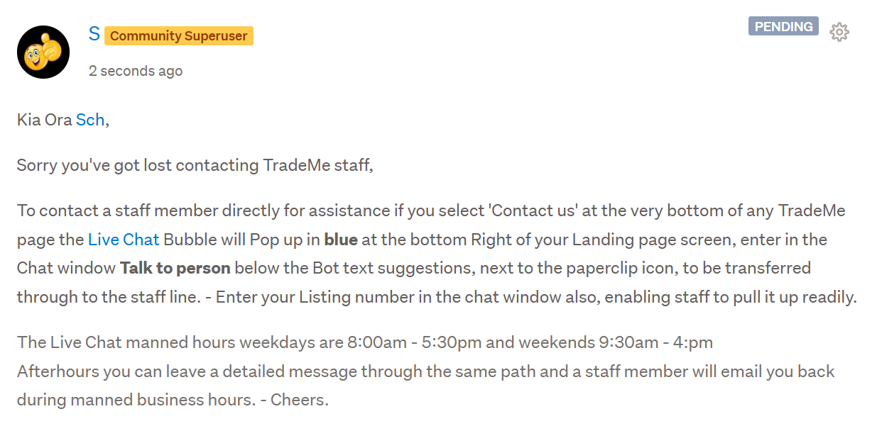 To contact a staff member directly for assistance if you select 'Contact us' at the very bottom of any TradeMe page the Live Chat Bubble will Pop up in blue at the bottom Right of your Landing page screen, enter in the Chat window Talk to person below the Bot text suggestions, next to the paperclip icon, to be transferred through to the staff line. - Enter your Listing number in the chat window also, enabling staff to pull it up readily.
