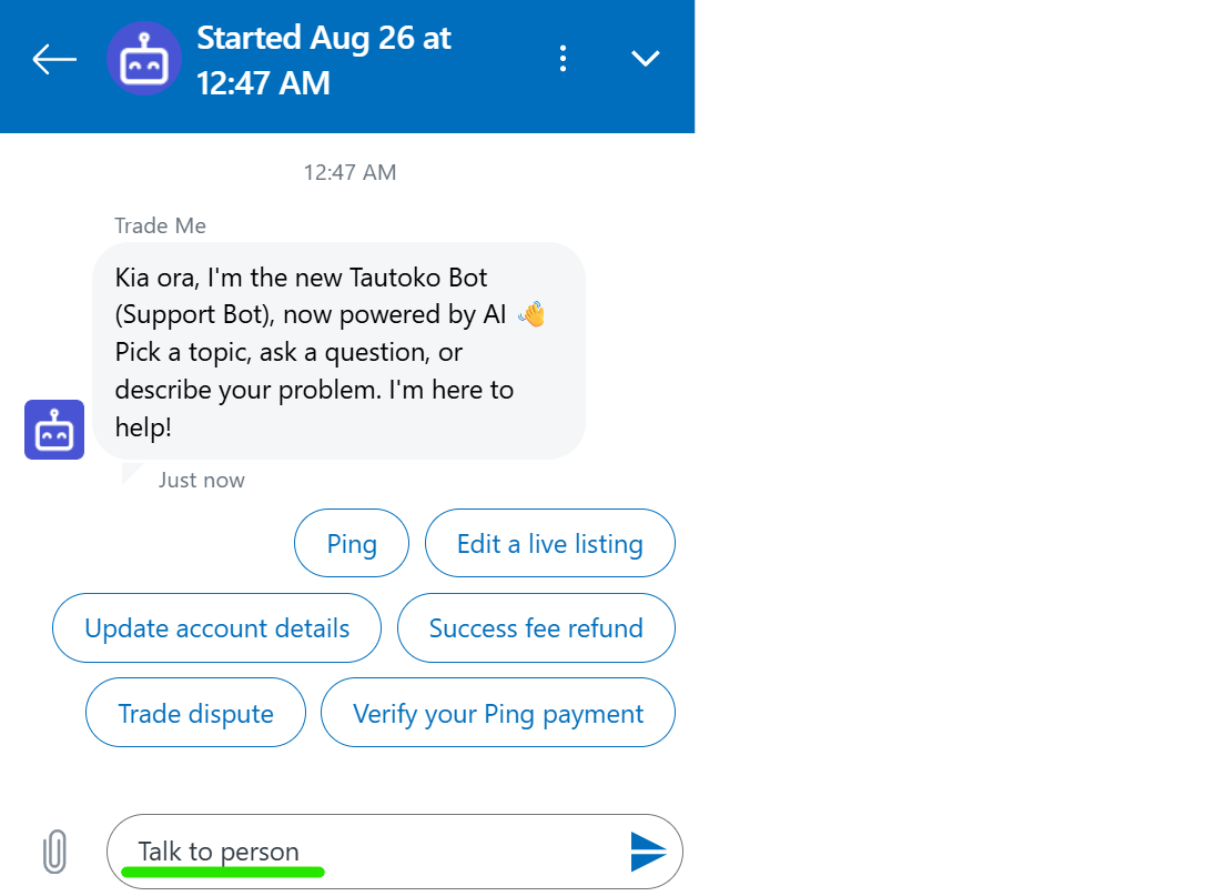 - Try contacting TradeMe, bypassing the Bot again.