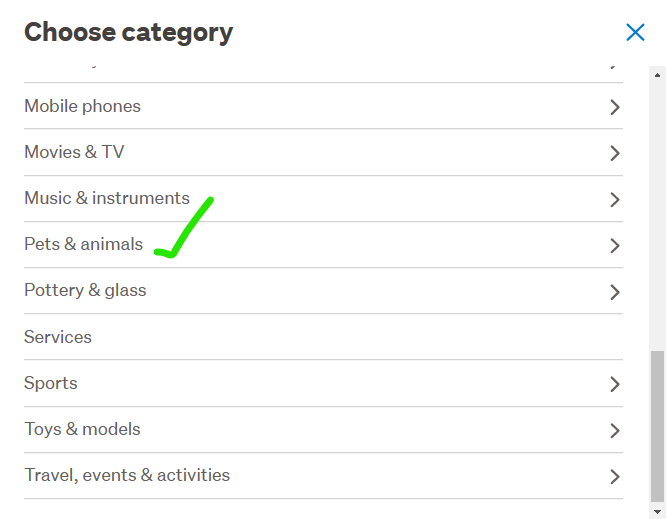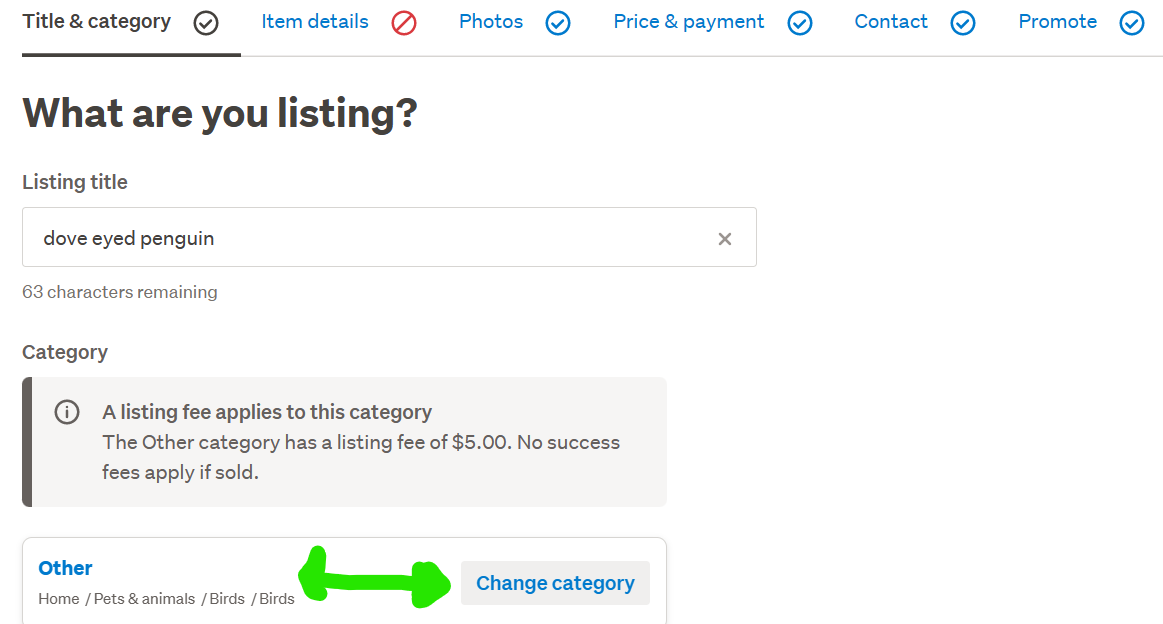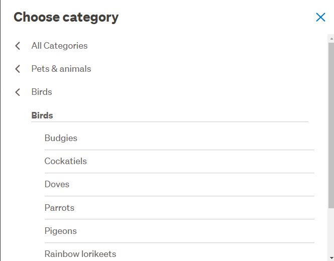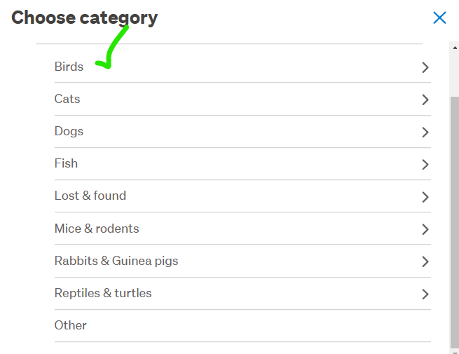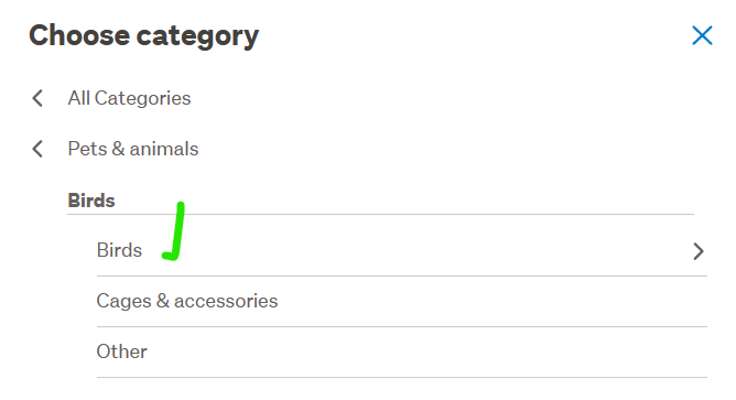 When I first went through to list, the category put me into Home/ornaments section as I selected the 1st Bird word that appeared for me in error so I had to select 'Change Category' so I could select 'Pets & Animals' - the Bird option was readily available for me to select ...