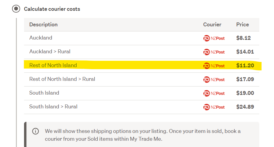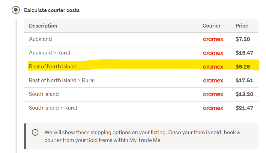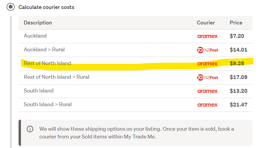 flossy63 Community SuperuserMy main courier is Aramex, I have no issues, and I courier hundreds of Parcels,I do not know why you have Issues?, But because you are having Issues, does not make me Incorrect at all, I have provided Screen shots above, showing my statement further back up is indeed correct,All my Courier bookings are pretty consistent, But yes there can be variations between locations like within South Island, which is normal, I have set shipping to cover all, I do not use the Trade Me templates, as they are a Quote/ Guide only, not firm prices as differ for some addresses, and no matter what the day is always the same, day after day, so do not know why they differ on different days on the day you book?, I never heard of that happening before,If you have issues like you say I suggest you contact Trade Me,1