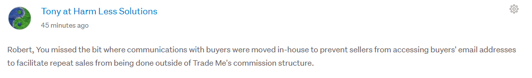 Nancy, the key things I saw in your post are the relationship between TradeMe and in-trade sellers is not even. If TM is our primary platform, sole platform, or where we derive most income from, then we are forced to toe the line no matter what the changes are - it's making to monopolistic pricing. Another point you raised is whilst in-trade sellers gain no advantages by declaring such, we are treated in a way that disadvantages us on the site thus (UN)fair trading.