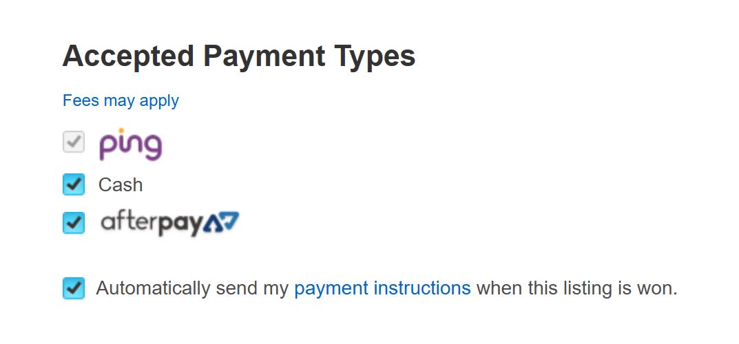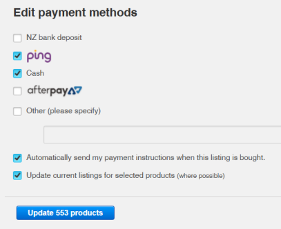 Note: The payment methods is a replacement method ie it won't recognise any existing payment methods in each listing but all all selected to the methods you have ticked.