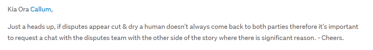 If you have already left a message for staff via the Chat Bot you should have received an email of the transcript, in this case you can track which stage your report is at by selecting 'My Requests' at the Top Right of Help & Community pages. - You can click into the subject line to bring the conversation up to add any new information, screenshots & request a Chat with the disputes team direct. - If you haven't left a message via the Chat Bot select 'Contact us' in fine print at the very Bottom of most TradeMe pages including your Post page - for faster assistance include you wish to chat with the Disputes Team, provide the dispute number you may've been emailed with, the Listing number or reference & attach screenshots/files of the print tests you took prior to the parcel being picked up as well as all correspondence with your Buyer so far including where you offered a 50% refund. - Once the team have had the opportunity to review your case you will hear back. - This can take some time to hear initially as the dispute winds through the usual process, normally 4 weeks at the start just to give you an idea. At any stage you can check the status, add further info' or make an enquiry through the My Requests.