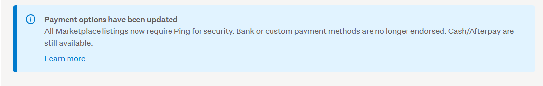 What the heck is going on? Does this mean that I can no longer have a bank deposit as an option? The message was not on an individual listing but rather displayed at the top of the unsold listings. Does trademe no longer want casual sellers anymore? I do not feel safe listing anything with this message present in case trademe decide to enforce it.