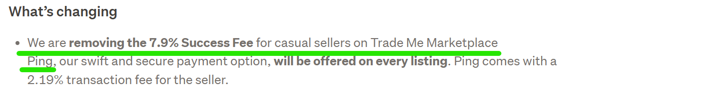 Kia ora hoboko02, Our 2.19% Ping fee is a competitive transaction fee that covers the cost of processing payments. This ensures your money shows up immediately and that the trade is fully backed by our protection policies. Buyers prefer Ping too, because if a trade goes wrong, they’re covered up to $5,000.