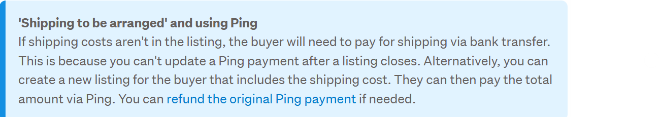 The options the company have provided are to allow a Bank deposit of the shipping amount Or set up a separate Listing solely for the shipping amount only for the Buyer to purchase Or set up a new Listing with the total cost including the shipping charge and refunding the Buyer their first Ping purchase in full once they've purchased the new Listing, it's a very messy double handling process for Both the Buyer & Seller when purchasing with no shipping cost added to the Live Listing prior to purchase.