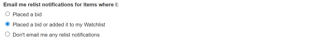 Hi S, under Email Preferences, Relisted Items, Auctions I placed a bid on or added to my Watchlist is selected. So they should recieve the emails.