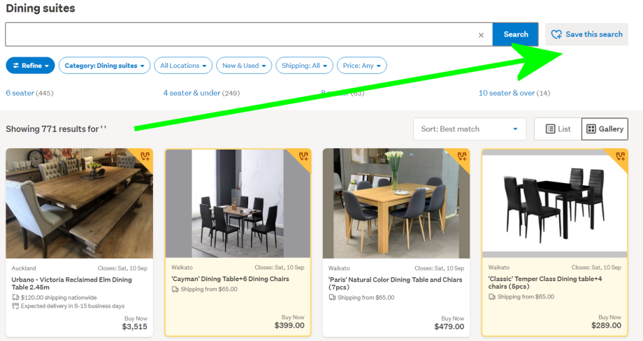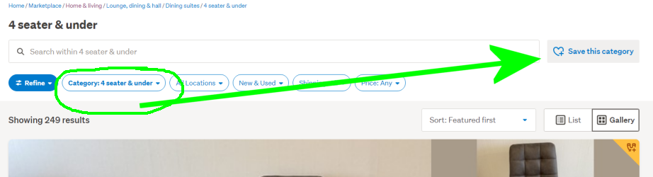 Hi Fraser, like I suggested above, you can put a blank space in the search box once in the Dining Suites category, or any high level category for that matter, and you then get the Save this search button.