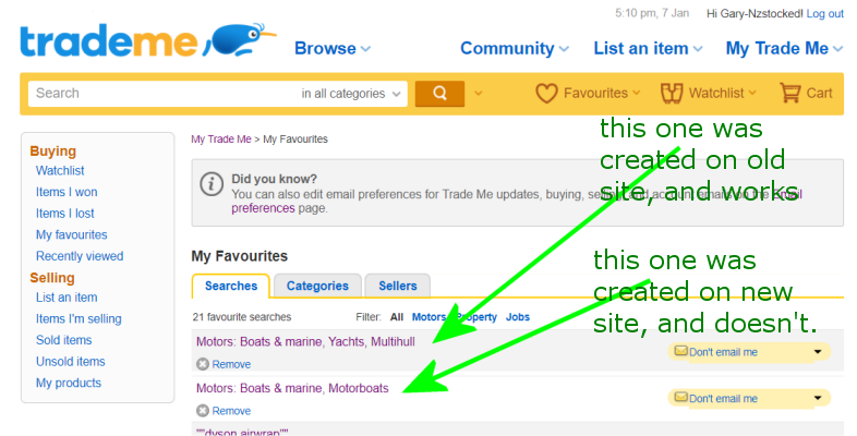 Thanks for that Gary! There are some minor differences between a saved search and a saved category favourite. The saved search will send an email with any new results that match your search query in the category, whereas a saved category search will email all new listings in that category. You can only save 'bottom-level' sub-categories as saved categories (e.g Pets & animals > Dogs > Dogs for sale > Terriers), where as the saved search can be made in any category and will include results in the sub-categories (e.g a search for "Terriers" in the Dogs category would return new listings that match in both the Dogs for sale, and Dogs to adopt category.)