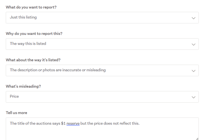 Once you click the Report this listing link a new tab opens and you can select the options that best suit eg.....