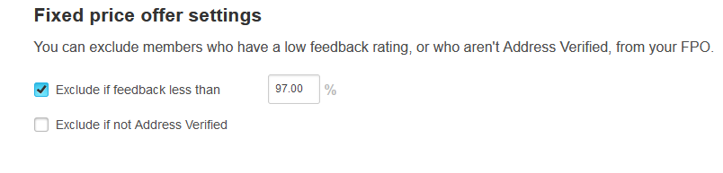 You can also set it up to exclude members who have a low feedback rating, or who aren't Address Verified, from your Fixed Price Offers.