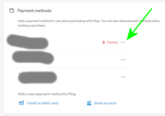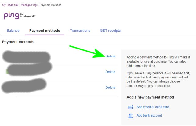 Manage Ping | Trade Me will take you to the image above where you select the 3 dots & the red Delete link appears. - You should be able to add a New Visa card without having to delete the old one first also. - You will need to be logged into the TradeMe Desktop site to select the link I've put here.